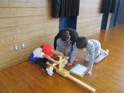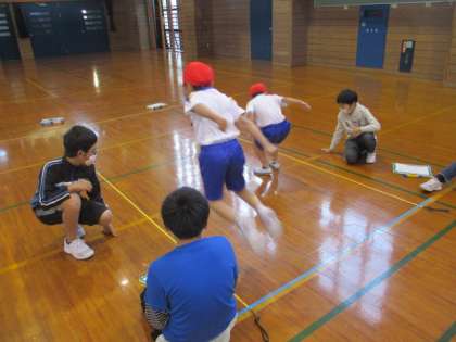 1年生の体力テストの計測補助をしました。立ち幅跳び、反復横跳び、長座体前屈の補助をしながら「もう一回頑張れ」「おおすごいね!」など、優しい声かけをしていました。