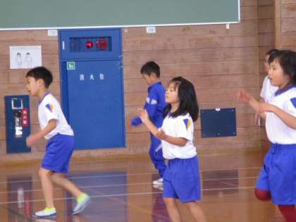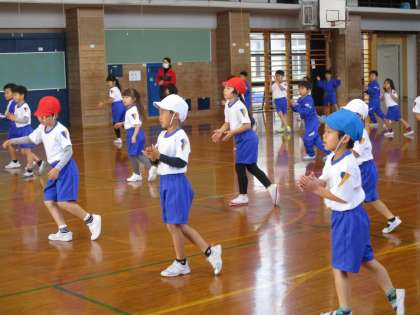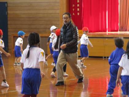 慣れてくると、曲のテンポがアップしたり「動きのたし算だよ。」と動きを増やされたり。「えーっ!」と言いながらも、一生懸命に先生の動きを真似て、元気に踊りました。