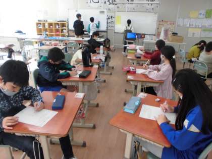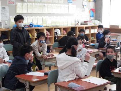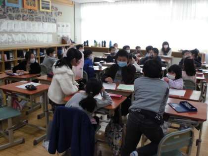 12月3日(木)の縦割りふれあいタイムに、集会委員会が企画した「ラジオ集会」が行われました。縦割り班でクイズに答え、リーダーが中心になって考えをまとめていまし。また、放送から流れるヒントを手がかりにして絵を描きました。子供たちは、描いた絵を見せ合い、楽しんでいました。