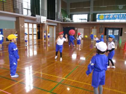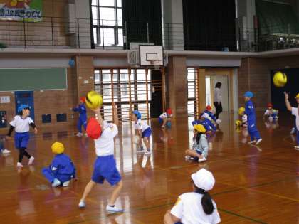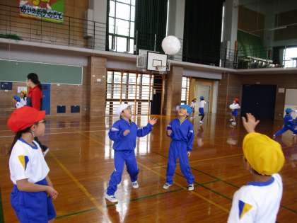 今は、ボールを投げる運動をしています。一人でボールを投げ上げてキャッチしたり、グループで風船やドッジボールをパスし合ったりと、簡単なボール操作に取り組んでいます。あちらこちらから笑い声が聞こえ、子供たちはとても楽しそうに活動しています。