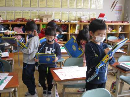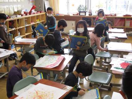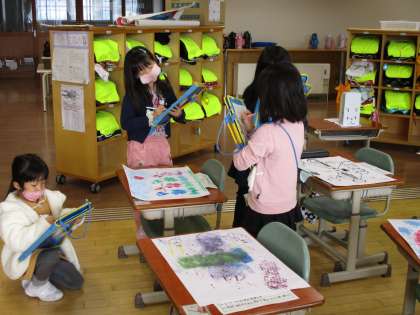 「写した形から」の作品を仕上げ、友達の作品を鑑賞しました。「色がきれいだね。」「スタンプの形で、お花に見えるね。」など、様々な視点から友達の作品の良いところを見つけました。