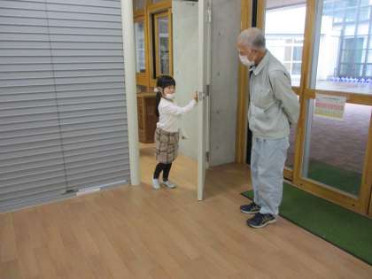 今回の避難訓練は、防火扉を一人ずつ操作し、火災発生時にどのように避難すればよいかを体験しました。体格の小さい子供にとって、防火扉を開けるときには、強い力が必要です。どのくらいの力が必要か、実際にやってみることが大切です。