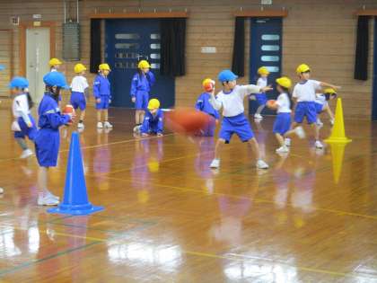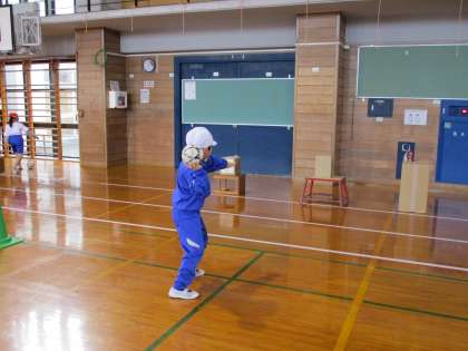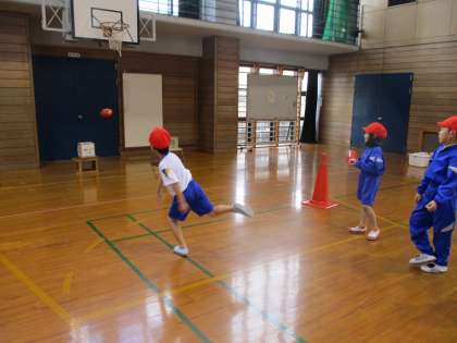 キャッチボールの他には、大きさの異なる段ボールを的にして、台から落としたり倒したりする的当てをしています。コントロールや投げるボールの強さも必要になってきますが、日に日に上達してきています。