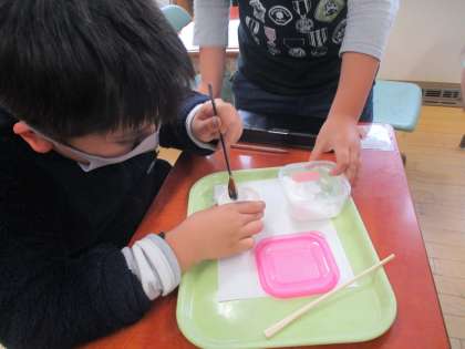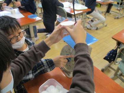 理科の「重さ」の学習で2回目の実験です。今回は、同じ体積でも重さがかわるのかを、砂糖と塩で比べました。体積を同じにするため、カップいっぱいの量にするのに一苦労。はじめは、カップを手でもって重さを比べてみました。「塩が重いような感じがするね」「絶対、塩が重いよ」と感触を確かめながら、計測です。すごい差が出た砂糖と塩の重さ比べ。重さがとても違ったことに、驚いていた子供たちです。