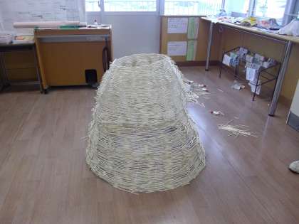 4年生の教室前で、割り箸を使って子供たちがあるものを作っています。これはいったい何になるのでしょうか。完成しましたら、またホームページで紹介します。