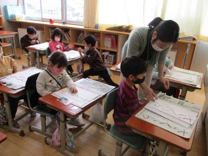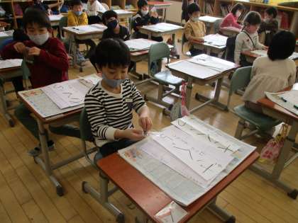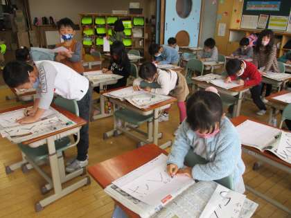 12月の書写は、書き初めの練習です。1年生の今年の課題は「さくら」です。使い慣れない硬筆墨に、始めは四苦八苦でしたが、次第に力の入れ具合や書く大きさ等に気を付けて書くことができるようになってきました。出来映えにも一喜一憂です。