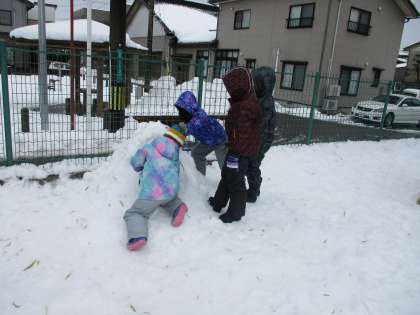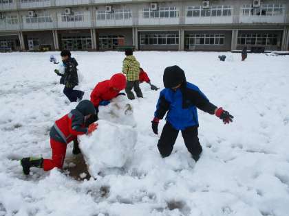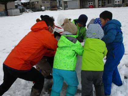 かまくらをつくる子、雪だるまをつくる子、椅子をつくる子など、思い思いの場所で声をかけ合って楽しそうに活動をしていました。中には雪を運ぶのに大きくなり過ぎて、校長先生に助けを求めるグループもあり、あちらこちらに協力し合う姿が見られました。