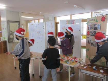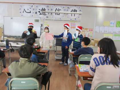 集会委員会の子供たちは、サンタの服を着て、各教室にお知らせに行ったり、メッセージを持ってきてくれた子供たちにプレゼントを渡したりしました。