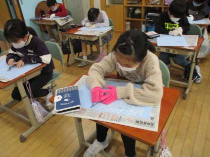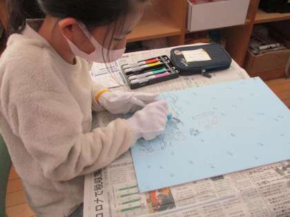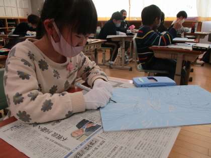 図画工作では、版画の学習をしています。初めての彫刻刀で、軍手をしながらがんばっています。スーッと動く彫刻刀の感触に「気持ちいいな」「彫りすぎないよう気をつけなきゃ」と進めています。3学期も版画の学習を楽しみにしている子供たちです。