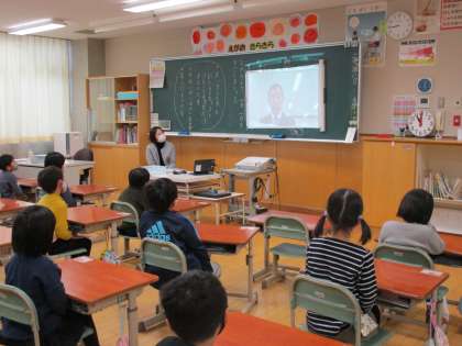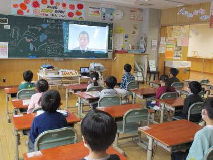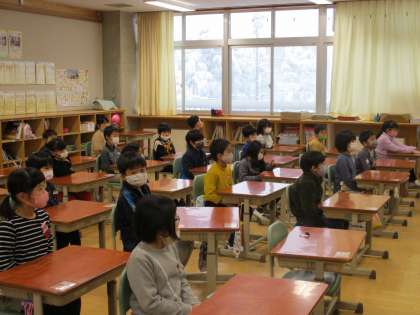 リモート始業式が行われました。校長先生の紙芝居によるお話や教頭先生の雪道に関する注意等を、元気よく返事をしながら聴きました。大変な雪道の中の登校となりましたが、それぞれが元気な表情で一安心です。