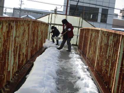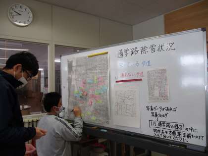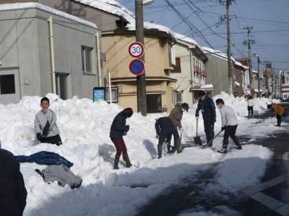 職員で分担し、子供たちの通学路を歩いて今日の状況はいかがなものか、危険箇所を確認しました。融雪のため、屋根雪のせり出しや落下、凍結、除雪状況を確認しました。その後は、PTAの方々と学校周辺や歩道橋の除雪作業です。圧雪を取り除くのは、たいへんでしたが、子供たちが安全に登下校できることを願っています。