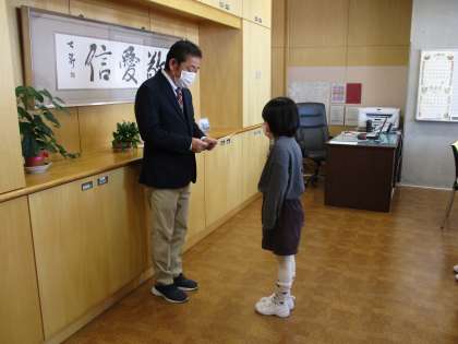 8日に行われた書き初め大会の授賞式が校長室で行われました。各クラスの代表者が賞状を授与されました。1年生は緊張の面持ちでしたが、教室へ戻ってからは笑顔を見せ、喜びを実感していたようです。
