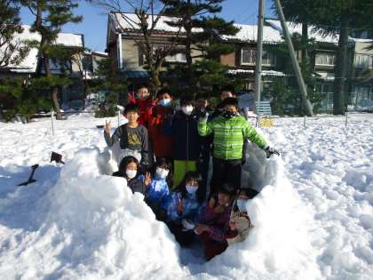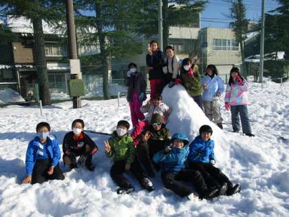 グラウンドにたくさん積もった雪を使って活動しました。団に分かれて協力して雪だるまや滑り台を作りました。赤団と白団の様子です。