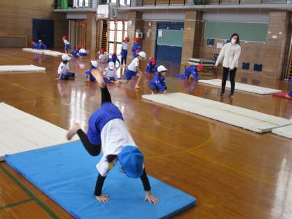 「マットを使った運動」が始まりました。だるま起きやうさぎ跳びをしました。だるま起きでは、転がった後なかなか起き上がれない子も多く、苦戦していました。うさぎ跳びでは、腕の支持を鍛える運動として取り入れましたが、高く足を上げられる子もいて、「すごい!」と注目されていました。