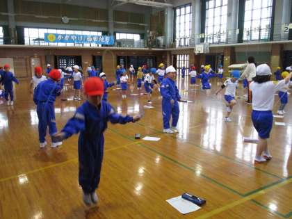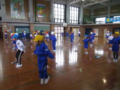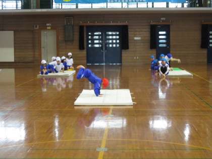 体育の時間の始まりに、準備運動と共に縄跳びにも取り組んでいます。何回跳べたか、目標をもって取り組んでいます。マット運動では、上手な友達の動きを見せてもらったり、コツを掴んで前回よりもできるようになったりする姿が見られました。