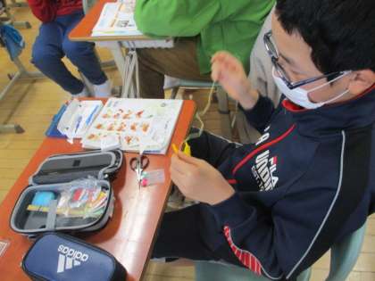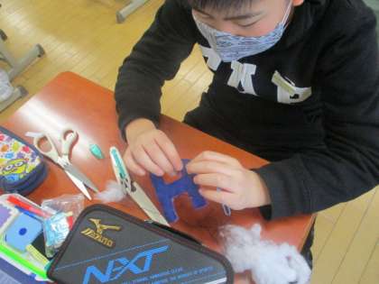 家庭科ではこれまで学習してきた裁縫の知識を生かして家族に感謝の思いを伝えるための作品を制作しています。子供たちそれぞれが「お母さんに喜んで欲しい」「いつも仕事を頑張っているお父さんにあげたい」と気持ちを込めて一針一針縫っています。