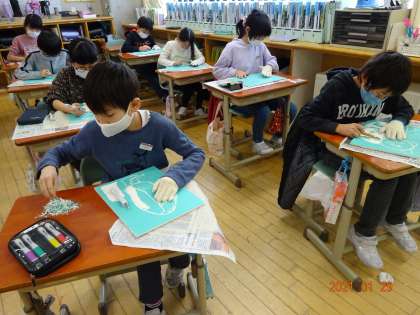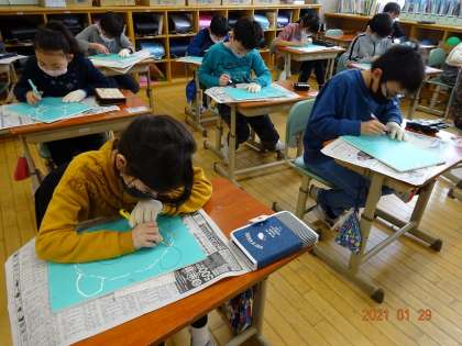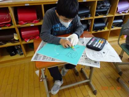 図画工作科「ほってすって見つけて〜動き出す 動物たち〜」の版画の学習では、自分の好きな動物を選び、動物たちの一瞬の動きや表情を表現しようと丁寧に彫っています。様々な動物の表情が見られ、完成が楽しみです!