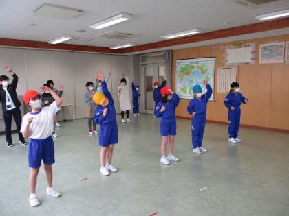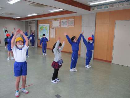 保健委員会の「姿勢体操で いきいき月間」に参加しました。2年生は、4年生と一緒にとなりのトトロの曲に合わせて、体のストレッチを楽しんでいます。