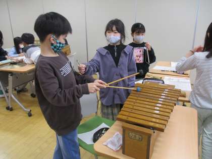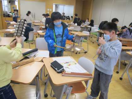 音楽の時間に、すず、小だいこ、シンバル、鉄琴など好きな楽器を選んで魔法の音を作っています。「ここは大きくしよう」「長くしたほうが響くね」などといいながら、グループで楽しみながら音作りに励んでいます。