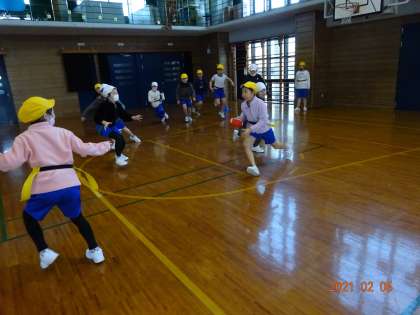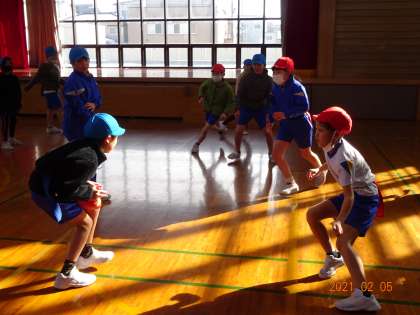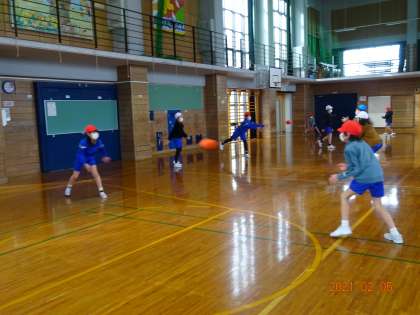 体育科「タグラグビー」の学習では、基礎練習をした後、色団別で試合をしました。作戦を立てながら、得点に結び付くようにパスを出しました。