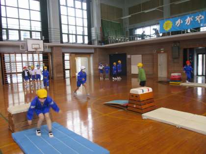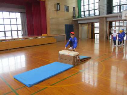 体育の学習で跳び箱競技に挑戦しています。開脚跳びができるようになってきたところで、閉脚跳びにトライ。まずは、台の上に乗ることを目指して練習しています。