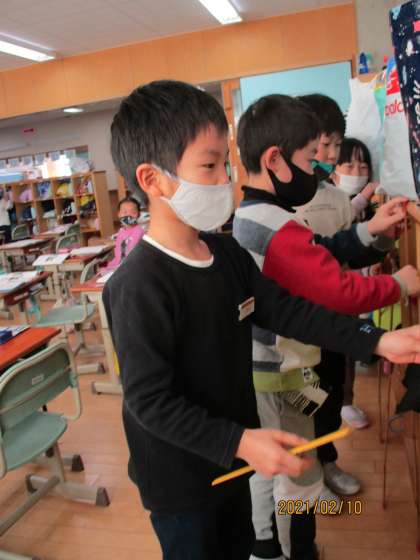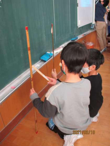 算数科の時間に1m物差しで1mくらいのものを見つけて長さをはかりました。