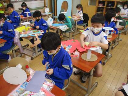 「かみざらコロコロ」の学習をしました。芯の付ける位置で回り方が変わるため、どこに付けようか考えることからスタートしました。回り方を決めたら、飾るものや飾る位置を考え、思い思いに切ったり貼ったりしながら楽しくつくりました。