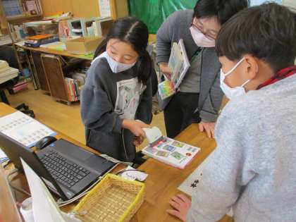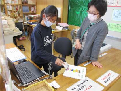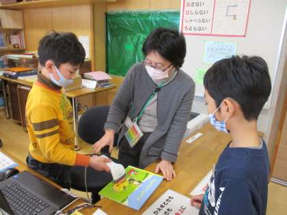 図書委員の仕事である、図書室の本の片付けや返却手続きを行いました。初めてのバーコード操作にどきどきの子供たちでした。