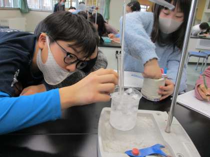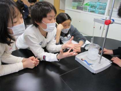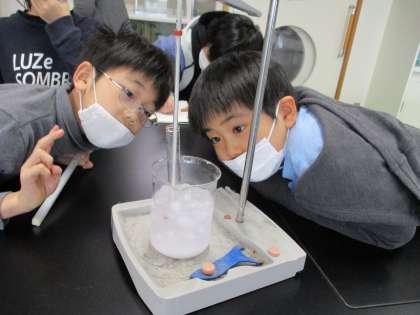 氷水と食塩を使って水を冷やす実験を行いました。「アイスキャンディをつくろう」を合い言葉に、どのように水の温度が変化し、凍っていくのか、丁寧に観察していきました。「なかなか温度が下がらなくなったよ。」「急に下がった。」など、驚きの声がたくさんあがり、実験を通してさらに疑問や課題をもてたようでした。