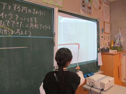 円の中に描いた三角形の特徴について学習しました。中心点と円上の2点を結んでできた三角形はどんな三角形になるのか。ノートに書いた自分の考えを説明しました。「そんな考えがあったんだ」「なるほど」と、友達の意見を聞きながら、うなずいていました。