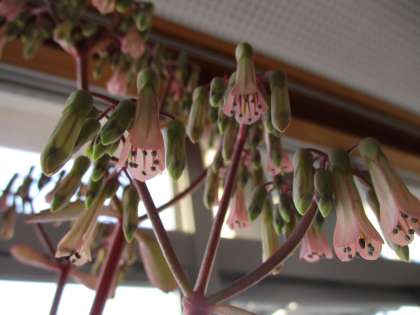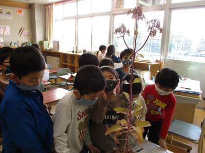 教室で、生き物係が中心となってお世話してきた子宝草が花を咲かせました。何年前からか、代々受け継いできた苗で、4年前にいただいてからは初めてのことです。きっと、今の生き物係が気持ちをこめてお世話してきたからでしょう。とても優しい姿の花です。