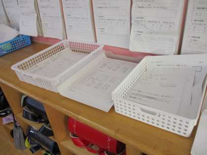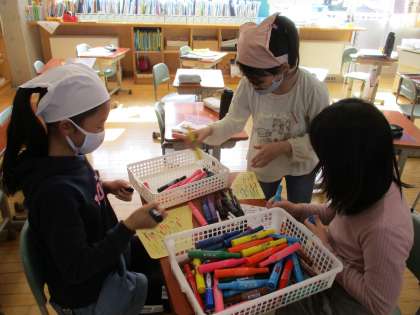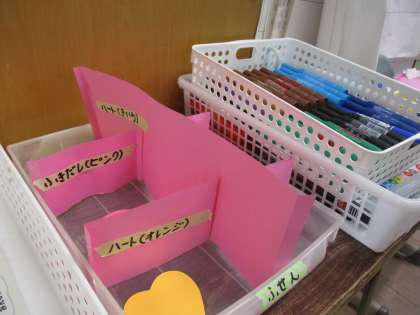 清掃の時間を利用し、教室の環境をよりよくしようと子供たちはリフォーム作戦に取り組んでいます。この日は、文房具コーナーが煩雑になっていたので、ペンや付箋を使いやすく整理しました。