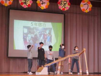 5年生の「思い出劇」の様子です。背景にこれまでの思い出がスライドショーで流れ、これまでのことを思い出しながら楽しみました。