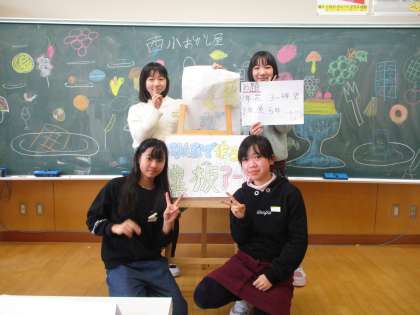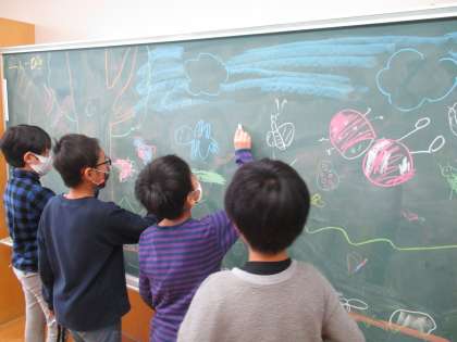 黒板アートの様子です。学年ごとに「魚」「お菓子」などお題を決めて、黒板をカラフルに彩りました。