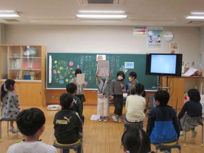1年生を招待して、生活科で学習した野菜のことや町探検のことを発表しました。学習したことをまとめた絵本やポスター、新聞を発表に活用ながら、グループごとに話す内容を決めて、1年生に伝えました。
