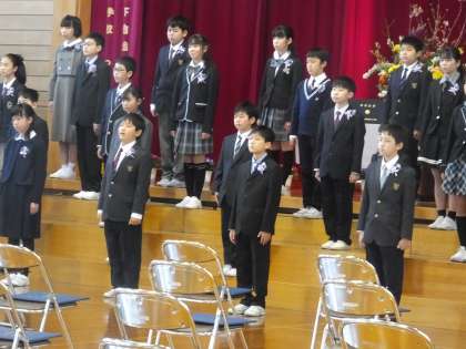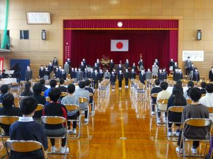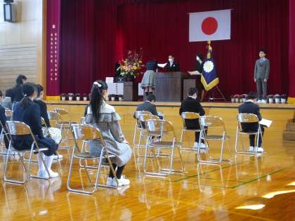 3月19日(金)に、令和2年度の卒業式が行われました。卒業生53名は、一人一人しっかりと卒業証書を校長先生から受け取りました。校長先生は、努力することをこつこつ積み上げることで夢に向かって頑張ってほしいと話されました。子供たちは、校長先生の話を心にとめて、未来に向かって頑張ってくれることと思います。