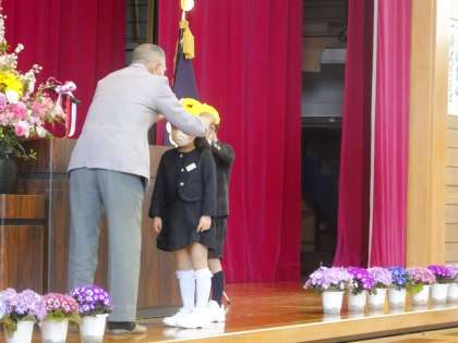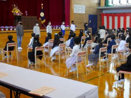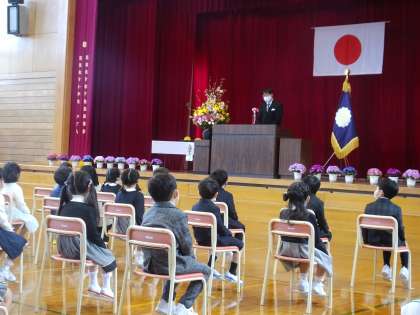 4月7日(水)に、入学式がありました。入学式で、校長先生は、「一生懸命に頑張りましょう」「友達をたくさんつくりましょう」と話されました。また、代表の6年生の子供が、学校生活の楽しさを紹介しました。新1年生の子供たちは、しっかり話を聞いていました。明日から交通安全協会の方からいただいた安全帽子をかぶって、元気に登校してほしいと思います。