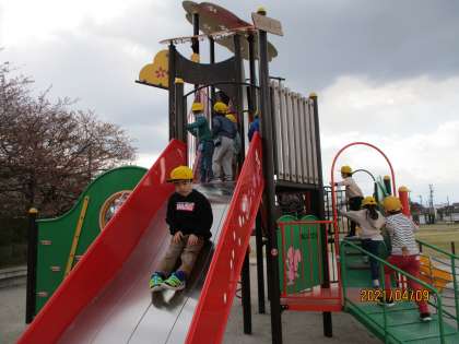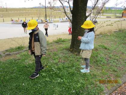 『まちの春を見つけよう』の学習で、磯部公園へ行ってきました。公園に着くなり、公園の散り始めた桜、足下に咲くタンポポ、オドリコソウ等を見つけて「きれい。」と思わず口々にし、自然と春を感じとっていました。春を見つけた後は公園で遊び、楽しい時間を過ごすことができました。