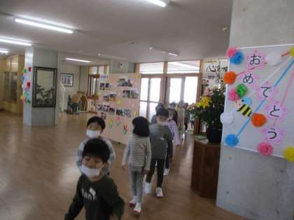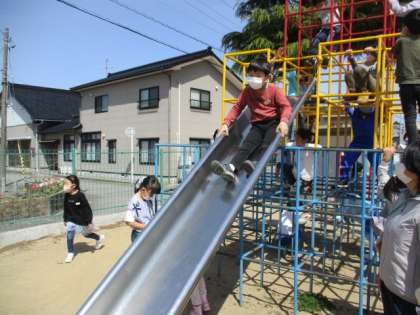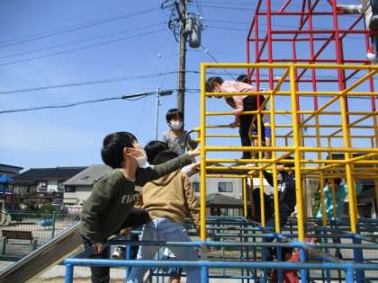 今日は、学校めぐりをしました。学校内には、さまざまな部屋があってとても広い校舎でした。最後はグラウンドにある遊具で遊びました!温かい日差しの中で、高いジャングルジムに登ると、とても気持ちがよかったです。