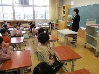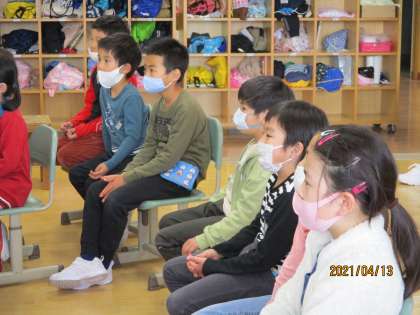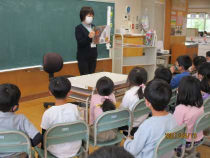 毎年4月に行われる図書館オリエンテーリング。今年度も、司書の先生から図書室の利用の仕方について話を聞きました。また、紙芝居を読んでもらったり図鑑の見方について教えてもらったりしました。