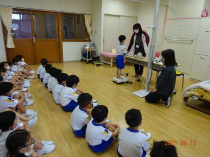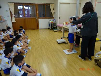 保健室の松森先生のお話をよく聞いて、静かに検査を受けることができました。六年間でどのくらい大きくなるのか楽しみですね!