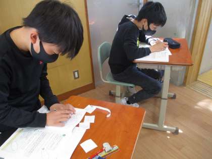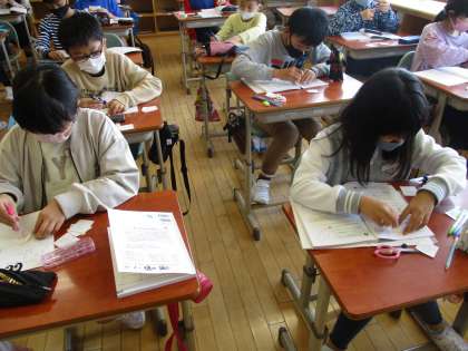 自分の考えを一生懸命に説明したり、形を切り取って作業したりしながら学んでいます。
