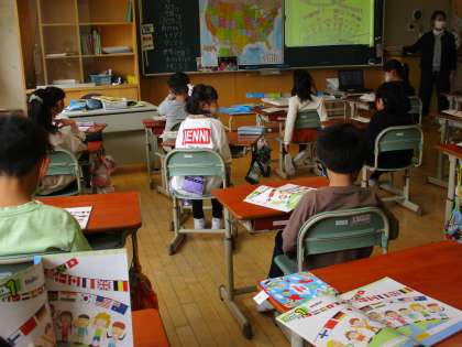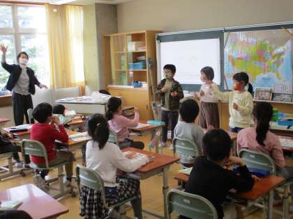 外国語活動の学習が始まりました。アメリカの地図を見たり、歌に合わせて自己紹介したりしました。