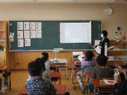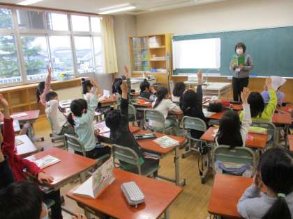 図書室オリエンテーションがありました。司書の先生が、国語科「図書館たんていだん」と関連させ、本の分類番号について話してくださいました。
