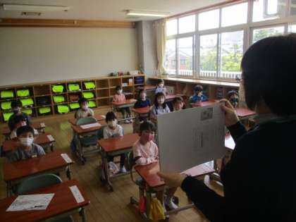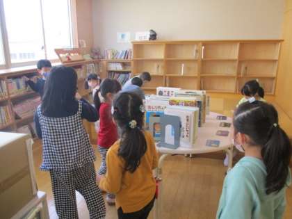 司書の佐藤先生に図書室の利用の約束や、本の貸出と返却の仕方を教えていただきました。「たくさんの種類の本があるよ。」「この図鑑を読んでみたい。」「わたしの知っている物語があったよ。」子供たちは目を輝かせながら、自分の読みたい本を選んでいました。