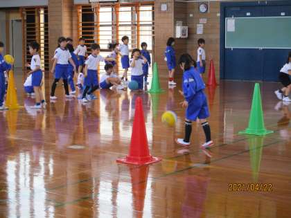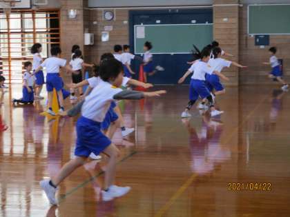 体育の時間に「多様な動きの運動」として、横向きで走ったり、スキップやボール付きをしながら走ったりする運動をしています。来週からは、運動会に向けた練習に取り組む予定です。