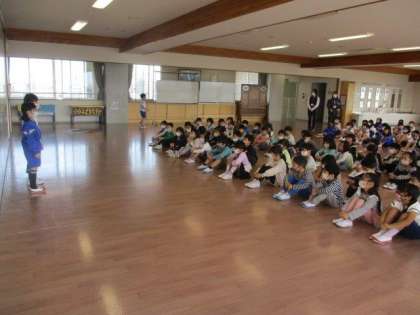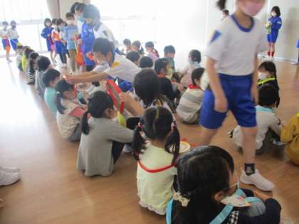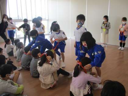 2年生さんから招待を受け、入学を祝う集会がありました。西田地方小学校のことを詳しく教えてもらいました。最後にメッセージの入ったステキなメダルのプレゼントがあり、とても嬉しそうでした。これから、お兄さんお姉さんともっと仲よくなるのが楽しみです。