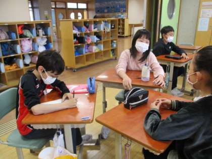 国語の時間に、友達へのインタビューの仕方について学習しています。聞き手、話し手、記録者と役割を決めて、いざインタビュー開始。「聞くことについて迷ってしまった」「質問に答えていたら違う話になっていた」「話すのが早くて書き切れない」とそれぞれの役割で気をつけることが見えてきました。工夫するところを考えて、再チャレンジします。