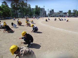 今日の朝活動は、3年生と一緒にグラウンドの草むしりをしました。運動会に向けて、キラキラのグラウンドにすることを目当てに、色団ごとに場所を決めて活動しました。すっきりした気持ちのよいグラウンドで、運動会の練習に励みます!!