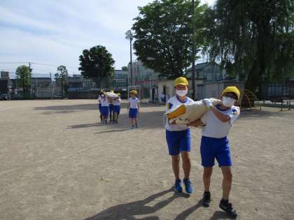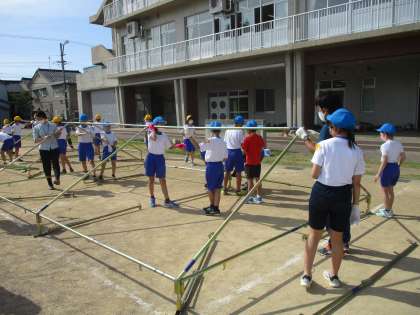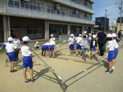 5・6年生と教職員で協力して、運動会のテントを運んだり組み立てたりしました。みんな一生懸命に働いていました。